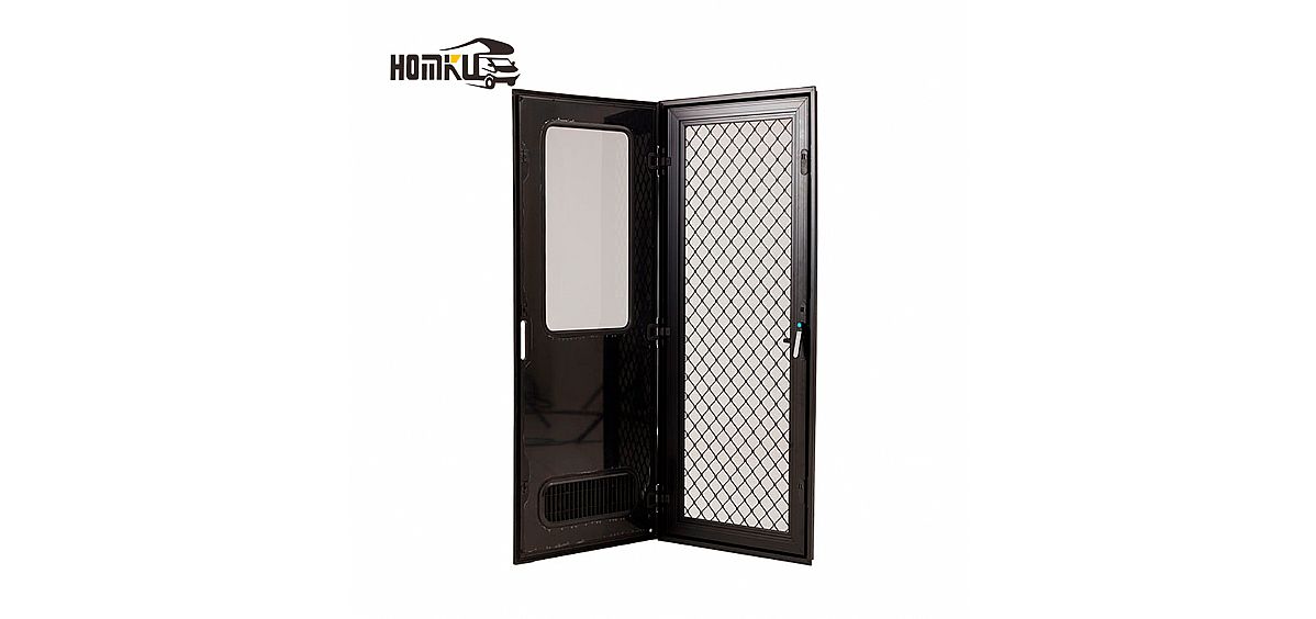 Fabricada con un marco de aleación de aluminio y con acabado de recubrimiento en polvo, la puerta está diseñada para uso exterior regular, manteniendo una apariencia limpia y moderna. La estructura de malla integrada favorece la ventilación, lo que resulta especialmente útil para caravanas aparcadas en climas cálidos o en campings donde los usuarios desean aire fresco sin sacrificar la practicidad.